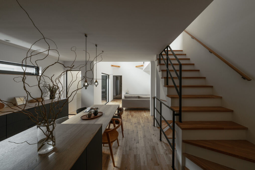 細長い敷地条件をいかし、吹抜けと坪庭をもうけることで、家の奥まで光と風をやさしく取り込み、住まい全体に開放感を広げました。